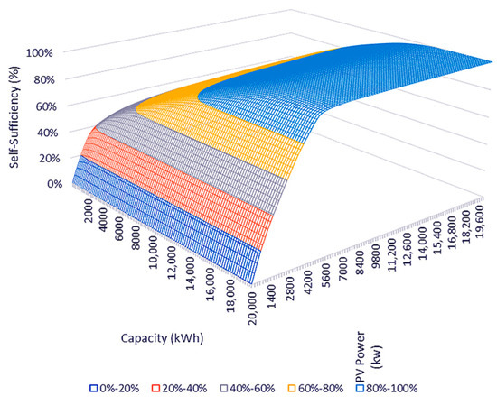In this scenario, the sufficiency cannot exceed 70%. To both locate and isolate the sets of decision variables for which the self-sufficiency exceeds a minimum of satisfactory percentage, a 3-dimensional scatter plot of the sufficiency, calculated for a wide range of PV power and storage capacity is formed, as shown in Figure 13.