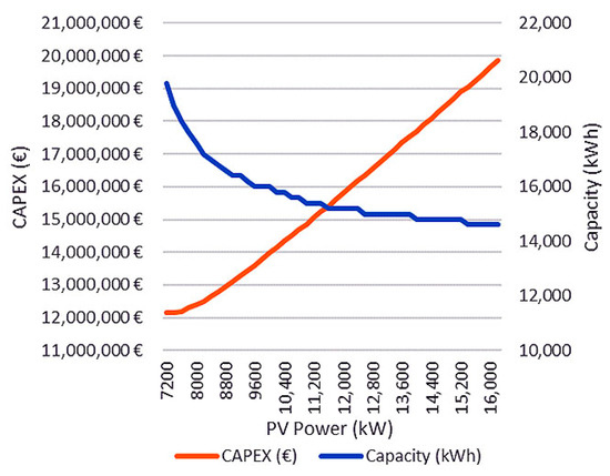 In Figure 14, the trend of CAPEX correlated to PV power and capacity is shown.