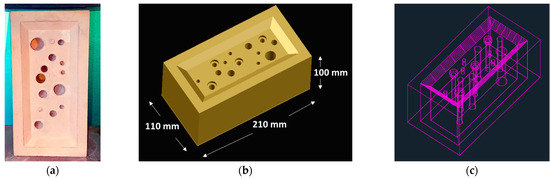 Bee brick (a) front view; (b) AutoCAD 3D-designed; (c) solid 3D-designed.