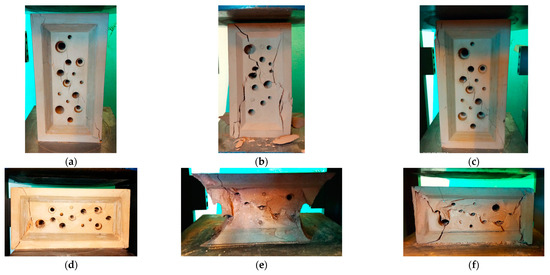 From the compressive test results, it is evident that the novel product provides significant mechanical strength. The characteristic failure modes of the solid bricks during the compression test are shown in Figure 3. Particularly, in Figure 3a–c the failure modes of the vertical specimen with loading direction parallel to the bed joint are depicted where the brittle diagonal cracks forming a cone-shaped fracture mode are visible [16,17]. Furthermore, the cone-shaped failure mode is more prominent with a load direction perpendicular to the long side of the optical brick in the compression test (Figure 3d–f). A general note is that the failure of all bricks was not explosive at all and the specimen remained in place with existing cracks. The locations and diameter of the cracks affect the pattern of the failure mode, a matter that is to be under investigation at a later stage.