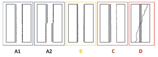 Figure 4 illustrates the failure modes of the triplets according to EN 1052-3 specifications. The characteristic patterns follow the four different failure modes (A1, B, C, D) with or without lateral compression for the shear tests. There are two distinctly categorized failure modes, namely A1 and A2, which fall under the purview of the A mode. A1 failure mode entails the failure resulting from the shear test in the bond area between a unit or mortar, either on one unit or between two units. Similarly, the A2 mode defines the failure that occurs only in the mortar faces due to the shear test. It is pertinent to note that shear failure in B mode is confined solely to the mortar, whereas C mode is employed to describe shear failure in the unit. Furthermore, D mode denotes the situation wherein the units exhibit crushing and/or splitting failure.