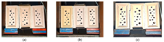Figure 5 shows the three triplets of bee bricks with their binding mortars. The three specimens failed through different brittle failures. In Figure 5a, the failure occurs with the separation of the mortar from the brick due to the weakness of the interface between the two materials. In Figure 5b, it is evident that the use of low-strength mortar to create a joint provides failure in the mortar layer (failure mode B), while the shear failure is divided between two-unit faces in the third triplet. For each specimen, its failure mode is detailed, which is type A1, B, and A2, as shown in Figure 5a, b, and c, respectively. Significantly, despite the extremely smooth surface of the solid brick, it was demonstrated to be expected that the interface would fail with the complete detachment of the mortar from the surface of the brick. Nevertheless, the results indicate that the low strength of the binder mortar plays an important role. Further analyses and results of direct shear values will shed light on the assessment of the compatibility of the two interfaces of the bricks and the masonry. Additionally, future exploration into using green materials and sustainable technologies could be applied to assessing bee bricks’ mechanical performance [18,19,20].