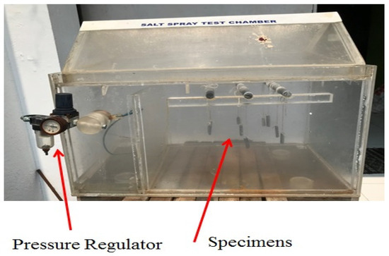The PM alloys studied were AA5052-H32, which has an ultimate tensile strength (UTS) of 222 MPa and a hardness of 65 VHN, and AA6061-T6, which has a UTS of 325 MPa and a hardness of 110 VHN. Welding was carried out using the tool rotation speed (TRS) settings of 900, 1000, and 1100 rpm, together with a constant traverse speed of 80 mm/min using the square pin profile of H13 tool steel. The SST specimen (40 mm × 10 mm × 5 mm sizes) was removed from the FSW regions along with the PM. The sample faces were subjected to polishing using SiC paper with grit sizes of 800, 1200, and 1500 before being cleaned with acetone and distilled water and dried with a moderate airflow. Before conducting the test, each specimen was precisely weighed as the specimens were roped and hung in the container, as shown in Figure 1. Approximately, the composition of the salt solution for 1000 mL was 5% NaCl, 1% MgCl2, and 94% de-ionised water. Throughout the examination, a hygrometer recorded a humidity of 98% at room temperatures of 33 °C to 35 °C. The pressure regulator maintains a constant air pressure of 2 to 3 bar for atomization. Each specimen’s adsorption weight was calculated after 72 h. The SST was used to collect the corroded samples, and the corrosion particles were removed by soaking the samples for 10 min in a separately prepared solution made up of 20 g of CrO3, 50 mL of H3PO4, and 1000 mL of reagent water heated to 90 °C. The final weight of the specimens was determined, and the sum of the net reduction was calculated. To determine the final weight loss, it can be calculated using Equation (1) [13].