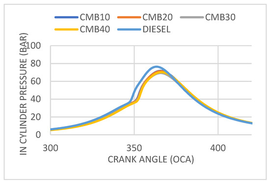 The in-cylinder pressure in relation to the crank angle is shown in Figure 2. The graphic makes it clearly apparent that the peak pressure increases as the applied load increases. This is due to the fact that as the load expands, more fuel is injected. The graph shows that the peak pressures for the different camelina biodiesel blends are almost identical [7], whereas the diesel shows a higher peak pressure due to its higher calorific value. For the blend CMB 20, the maximum peak pressure obtained was 71.24 Bar.