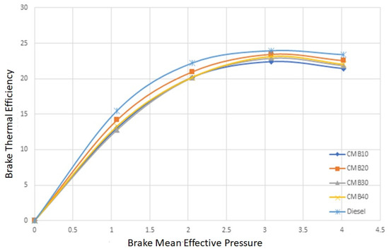 The brake thermal efficiency (BTE) of various mixes of camelina biodiesel and diesel is shown in Figure 4. The engine’s thermal efficiency varies depending on the engine load, as seen by the brake thermal efficiency graph. The BTE is a percentage indicating how much of the fuel’s energy is used to produce useful work. This graph offers important details about the engine’s capacity to transform fuel energy into productive work. Better fuel efficiency and overall engine performance are indicated by improved brake thermal efficiency [9]. Among the various biodiesel blends, CMB 20 exhibited higher efficiency rates than the other blends and was sightly similar to diesel. CMB 20’s peak value point in the graph is at 23.458%.