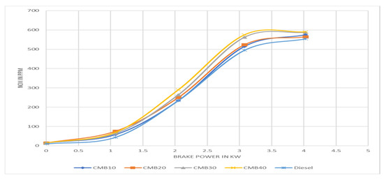 The NOx emissions of different camelina biodiesel and diesel mixes are displayed in Figure 7. The nitrous oxide (NO) and nitrogen dioxide (NO2) gases that are created during combustion processes are represented collectively in these test results. These emissions are a result of the air’s nitrogen and oxygen reacting at a high temperature during combustion. NOx emissions are a significant source of air pollution and can have a bad effect on the environment and human health. The graph shows that, when compared to diesel fuel, the NOx emissions for the CMB 20 and CMB 10 fuels were found to be similar, with values of 524 and 515, respectively. High temperatures, N, and O2 are all necessary for NOx generation, and the amount of NOx generated grows as O2 concentrations rise. Because our biodiesel blends include more oxygen than conventional diesel fuel, there are more combustion zones and more fuel-rich zones, which results in higher NOx emissions. Additionally, the SFC of the biodiesel blends was found to be greater than that of the diesel fuel, which further contributes to the creation of NOx emissions. This, in turn, leads to a rise in the number of zones with high ambient temperatures, which in turn causes an increase in NOx generation [13,14].