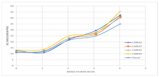 Figure 8 shows the hydrocarbon (HC) emissions of various biodiesel and diesel mixes made from camelina sativa. Due to the fact that biodiesel has a greater oxygen content than diesel fuel, which increases the combustion efficiency and lowers the amount of unburned fuel, the HC (hydrocarbon) emissions are often lower for biodiesel blends than for diesel fuel. The graph shows that the HC values of the CMB 20 fuel were discovered to be lower than the other fuel blends and that its values were comparable to those of diesel. The oxygen content of this biodiesel is what caused a drop in its HC emissions. The kind of engine used also affects these emission values. Additionally, one of the elements contributing to higher HC emissions is thought to be an engine’s high compression ratio [15].
