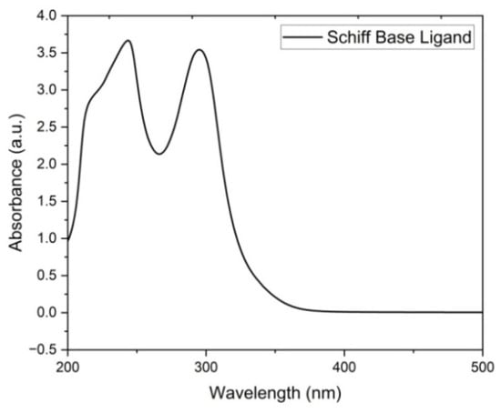Figure 1 shows the absorption spectra of the ligand 1-(3-chlorophenyl)-N-(pyridine-2-yl)methanimine and exhibits characteristic bands at 212.63, 231.27, and 311.67 nm. The absorption bands at 212.63 and 231.27 nm correspond to the π–π* transition, while the peak at 311.67 nm indicates the appearance of the n–π* transition. The changes in electronic energy levels suggest that the ligand contains an azomethine group [14,15]. Figure 2 shows the absorption spectra of the complex and it is noted that the copper complexes exhibit a distinct absorption band between 276.68 and 313.77 nm, which indicates the formation of a complex ion. Data pertaining to the spectral properties are given in Table 2.