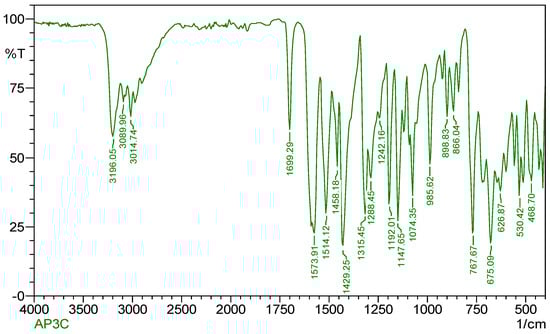Figure 3 indicates the IR spectra of the ligand (CPPM) which shows a moderately intense band at 1699 cm−1 and it is ascribed to the ν(C=N) vibration of the azomethine group [16]. A band in the 1434 cm−1 region shows the occurrence of an aromatic ring, while in Schiff-base complexes, its presence is confirmed by a band appearing in the 1667 cm−1 region, which corresponds to the ν(C=N) band. IR spectral data of Cu(II) complex of the ligand CPPM are given in Table 3.