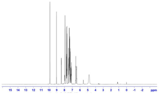 The presence of the azomethine proton was indicated by two peaks in the 8.2–8.8 ppm range. A series of multiplets between 6.58 and 7.7 ppm was attributed to the aromatic protons. The results align with conclusions derived from the analysis of the IR spectrum (Figure 4).
