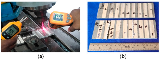 Experimental setup: (a) Close view of sound and temperature measurement for fifth exp. in down-milling; (b) workpieces after up- and down-milling process (150 × 70 × 6 mm-l × b × t).