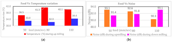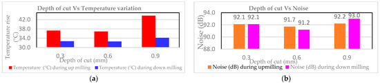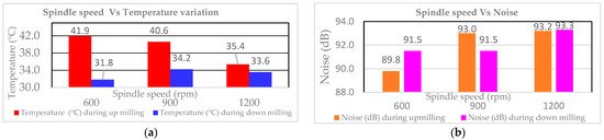 From Figure 2a, with the rise in “S”, the temperature generation decreases for up-milling and increases for down-milling due to the cutting process, becoming more adiabatic as the cutting speed increases. Compared with up-milling, the temperature generation is low in down-milling because the chips are easily disposed of compared with up-milling and do not interfere with machining, thus reducing the temperature. From Figure 2b, the noise increased with an increase in “S” for both up-milling, and down-milling. The down-milling produced lower noise than up-milling since the chip clogging is less frequent in down-milling.