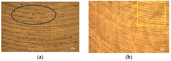 To analyse the appearance/features of the machined surfaces, microstructure images were taken. Figure 5a,b display the microscope images of machined surfaces with 100× magnification from an optical microscope for up- and down-milling, respectively, for the fourth experimental condition in which the temperature and noise values are near their average values. Figure 5a depicts the surface with prominent shearing marks in curved shape (marked with yellow square-shaped box), and deeper batches of ripping areas are marked with elliptical shape (marked using blue colour) from up-milling. Figure 5b displays a smoother surface than Figure 5a with a low level of these markings. As a result, down-milling created a smoother surface since chips may readily leave the workpiece.