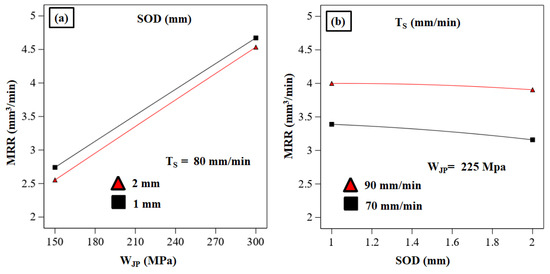 Figure 1a shows the interaction plot of WJP and SOD for MRR. When the water jet pressure was set at the maximum value of 300 MPa and the SOD increased to 2 mm from 1 mm, the MRR increased from 4.353 to 4.672 mm3/min. This was due to the water jet pressure helping the abrasive particles penetrate the material more efficiently, resulting in a greater depth of cut and a wider cut width. This increased material removal means that more material is removed in a given time, contributing to a higher MRR [7]. Conversely, when the SOD was set at the maximum value of 2 mm and the traverse speed increased from 70 mm/min to 90 mm/min, the MRR rose from 3.158 mm3/min to 3.904 mm3/min. When combined with the water jet pressure, the higher traverse speed increased the cut depth and overall material removal, contributing to a higher MRR [8].