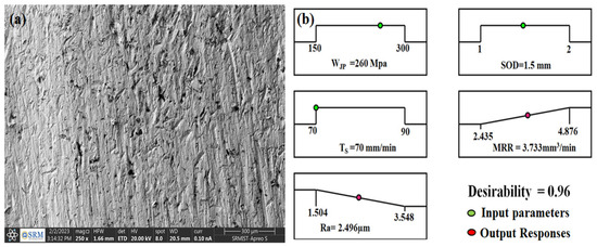 SEM and Ramp graphs of the optimized machined sample are illustrated in Figure 3a,b. Figure 3a shows an SEM micrograph of the AISI 431 alloy at optimized parameters, which indicates the smooth surface. Figure 3b shows that the ramp diagram is highly effective for validating the interaction between process variables and reactions to achieve optimum conditions for the AISI 431 alloy [11]. A high value of WJP and TS significantly increased uniform erosion, offering a smoother surface and higher MRR.