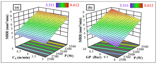 Laser power (P) vs. cutting speed (CS) 3D interaction graphs are shown in Figure 1a. The MRR increases from 3.511 to 7.808 mm3/min when the CS is set at 5 m/min and the P is altered from 2500 to 3500 W. The nitrogen gas jet expels a lot of molten metal at high power because a high power intensity increases heat flux into the workpiece and melt zone temperature. Laser power significantly affects MRR [6]. A 3D plot of laser power and gas pressure interaction graphs are shown in Figure 1b. The MRR rises from 7.432 to 8.612 mm3/min when the P is set at 3500 W, and the GP is set at 10. The significant drag force of a high-pressure gas flow increases the maximal material removal rate at high GP [7].