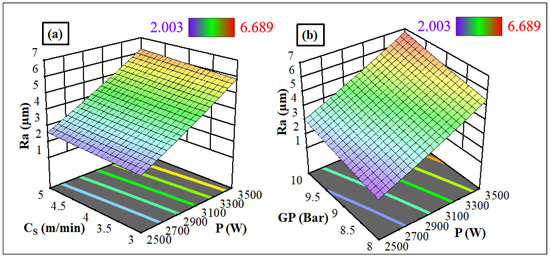 Figure 2a depicts 3D surface roughness plots as a function of power and cutting speed. When the P and CS were held at 2500 W and 5 m/min, respectively, the minimum Ra of 2.003 µm was noted. In contrast, a maximum Ra of 6.689 µm was obtained at a power of 3500 W and the same CS. By raising the CS and power simultaneously, the laser beam power was considerably enhanced, melting materials quickly and decreasing surface quality [8].
