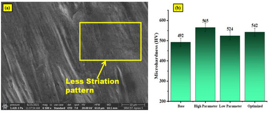 Figure 3a,b display the ideal machined sample’s SEM and microhardness graphs. Figure 3a shows the smooth surface with less striation. Similarly, Figure 3b depicts the microhardness of the AISI 431 alloy at different parameters; high-level machining parameters increased the microhardness. Table 2 describes the optimized machining levels with error percentage.
