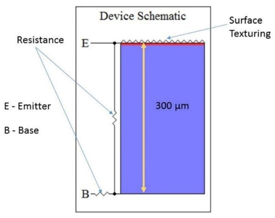 A solar PV cell with a thin N-type emitter layer and a hilly textured surface was designed using PC1D software. It has a front surface area of 200 cm2 and a thickness of 200 µm and features series and shunt resistance. In Figure 1, the solar PV cell designed in PC1D is shown with an initial texture depth of 1 µm and a front surface reflectance of 30% at a 50° inclination. The simulation was conducted using an air mass code of AM1.5 and 1000 W/m2 constant light intensity. The base contact resistance was set to 0.15 Ω, while the internal conductance was 0.3 S. Table 1 shows the values of the Si parameters used in the simulation, where the test temperature was set at 25 °C and the carrier excitation was frequency set to 20 steps.