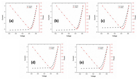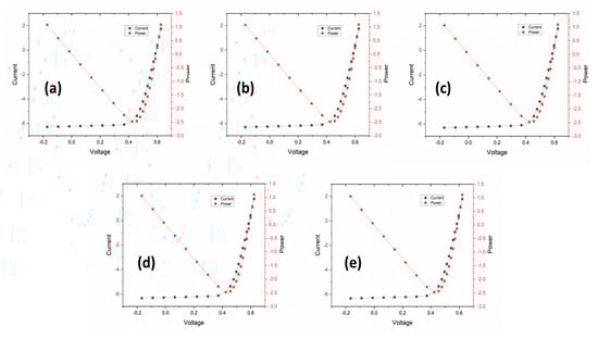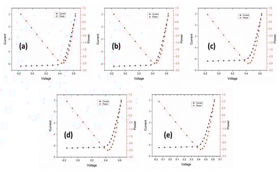 I−V curves of 2.5 µm thick surface texture and angles of (a) 50°, (b) 55°, (c) 60°, (d) 65°, and (e) 70°.