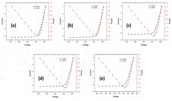 I−V curves of 1.5 µm thick surface texture and angles of (a) 50°, (b) 55°, (c) 60°, (d) 65°, and (e) 70°.
