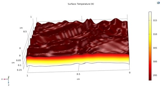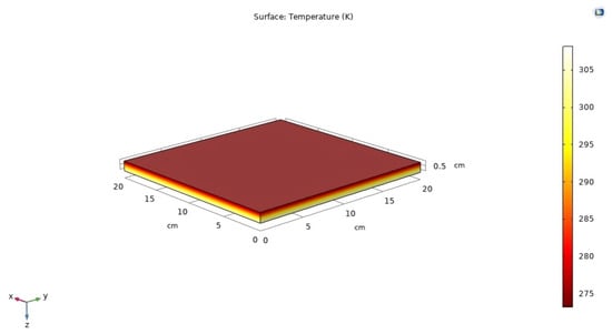 This section presents the analysis of the PV system using COMSOL 6.0. The surface texturing forms pyramid-shaped surfaces on the PV, which traps most of the light and reflects internally, which in turn improves the performance parameters of the solar cell. Figure 7 depicts the simulation of the heat transfer in a PV solar cell at room temperature.