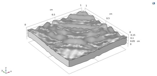 In COMSOL, a rough surface is formed to analyze the absorption of heat and light. In this dimension, x and y remain at 1 cm and the surface roughness using the mathematical equation. In actual practice, texturing is performed by etching or using photolithographic methods. This forms a pyramid-like structure which helps in absorbing the heat and light energy. The dimension of the z surface is given by varying the value of W in the equation, which indicates surface roughness. When the angle of W decreases, the surface roughness increases. The simulation of a rough surface silicon block is shown in Figure 8. The parametric surface equation used is given below.