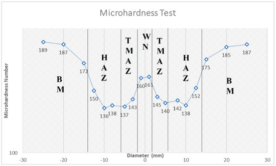 The microhardness values of the indentations can be used to figure out how the SiC particles are distributed in an AA7050 matrix. The presence of SiC particles was expected to increase the hardness of the material. Figure 2 depicts the microhardness results obtained, with the help of graphs, from the different zones of the weldments (i.e., WN, TMAZ, HAZ, and BM). The results from the sample are quite remarkable, which show the hardnesses at different zones of SiC reinforcement in AA7050.