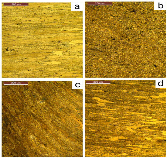 Micrographs of different zones of FSP sample: (a) BM, (b) WN, (c) TMAZ, and (d) HAZ.