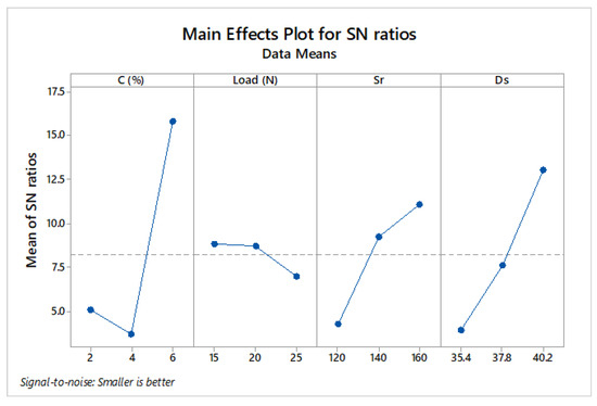 After conducting the wear test and analyzing the results, the optimal combination of input parameters for minimizing the responses was determined using the S/N analysis method. The S/N ratio was computed by taking the logarithm of the reciprocal of the squared deviations from the target values, with the lowest value serving as the target for the Swr and the highest value serving as the target for the CoF. Figure 3 illustrates the optimal combination of input parameters, including 6% SiC nanoparticle loading, 15 N of load, 160 RPM of rotation speed, and 40.2 mm of sliding distance, selected based on the desirability function, which measures the proximity of the response to the target value. The wear test outcomes indicated that both the Swr and CoF decreased as the percentage of SiC nanoparticle loading increased. The optimal combination of input parameters was found to be 6% SiC nanoparticle loading, 15 N of load, 160 RPM of rotation speed, and 40.2 mm of sliding distance, resulting in the lowest Swr and CoF. This S/N ratio analysis approach effectively determined the optimal combination of input parameters to minimize wear in the composite material.