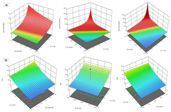 The outcomes of the wear test are further analyzed in Design Expert to investigate the effects of the composition of SiC, load, speed of rotation, and sliding distance on both the Swr and CoF. Figure 4a shows the contour plot of the Swr, indicating that an increase in the percentage of SiC nanoparticles, coupled with a decrease in the load, speed of rotation, and sliding distance, results in a decrease in the Swr. Similarly, Figure 4b shows the contour plot of the CoF, indicating that an increase in the composition of SiC nanoparticles, coupled with a decrease in the load, speed of rotation, and sliding distance, results in a decrease in the CoF. The results suggest that increasing the composition of SiC nanoparticles and reducing the load, speed of rotation, and sliding distance can significantly reduce the Swr and CoF of the composite material. This can be advantageous in applications where the material is subjected to wear and friction, such as in bearings, gears, and other mechanical components. The insights gained from this analysis can be used to optimize the manufacturing process and improve the performance of the material in real-world applications.