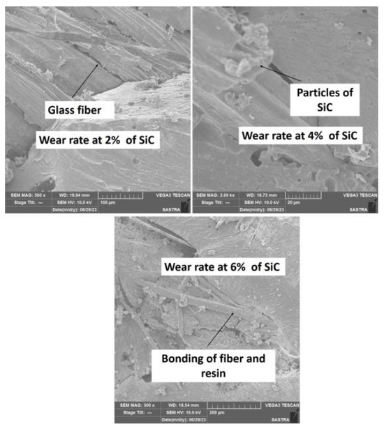 The SEM analysis in Figure 5 illustrates the wear mechanism on the sample surfaces under optimal conditions. SiC nanoparticles and glass fibers are embedded within the composite material matrix. SEM images show that the wear rate is lowest at a 6% SiC composition compared to 2% and 4%, indicating SiC’s reinforcing effect. SiC nanoparticle size and distribution vary with the composition percentage. A better bond between fiber and resin is observed in SEM analysis, correlating with reduced wear as SiC composition increases.