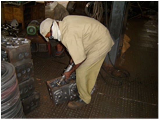 The study aimed to assess the hand-arm vibration felt by workers in a typical fettling work setting. To achieve this, a subject was selected, and the purpose of the experimental measurements was explained to them. The measurements were taken regularly during the worker’s job, without disrupting their work, to ensure accurate results. The selected subject was a 52-year-old worker who weighed around 62 kg and had over five years of experience in fettling work. The component being worked on was a sub-assembly. Figure 1 shows the typical posture the worker would assume during work, providing a visual reference for readers to understand the subject’s positioning during the experiment. By selecting an experienced worker and conducting measurements during regular work, the study aimed to provide a more realistic understanding of the hand-arm vibration experienced in the fettling work setting.