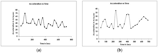 During the study, the vibration levels for the swing grinder were recorded frequently. Figure 2 shows the pattern of vibration recorded during the measurements. It can be observed that there is a wide variation in the acceleration levels produced by the machine during work. However, it is essential to note that these values are the raw data collected on the shop floor and are subject to fluctuations due to various factors. This provides a more reliable representation of the actual vibration exposure experienced by the worker. To accurately assess the risk to the subject, the root-mean-square (RMS) values of each task are estimated individually, after which the exposure points for the subject are calculated.