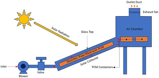 An air double-pass indirect-type solar dryer is shown in Figure 2. Ahmed J. Hamad et al. [] conducted an experiment using two PCMs (PCM1: paraffin wax; PCM2: paraffin RT-42) with different melting points placed on the bottom part of collector and drying chamber. The product used was chili. The drying test was conducted in three cases, one without a PCM using a natural convection process, one without a PCM using forced convection and another with a PCM using forced convection. High performance, a fast drying rate and high drying efficiency are found with PCMs using forced convection. Using multiple PCMs, it was found that the thermal efficiency of the solar collector and the thermal efficiency of the drying chamber were much higher.