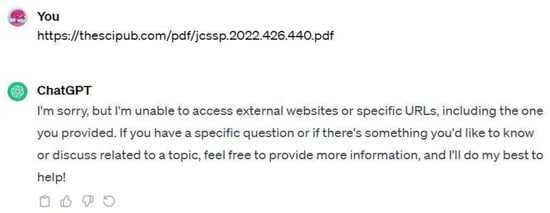 An attempt was made to summarize a research paper by providing a URL. The screenshot of the response from ChatGPT is given in Figure 1. It is evident that it fails to summarize the research paper given as a URL.