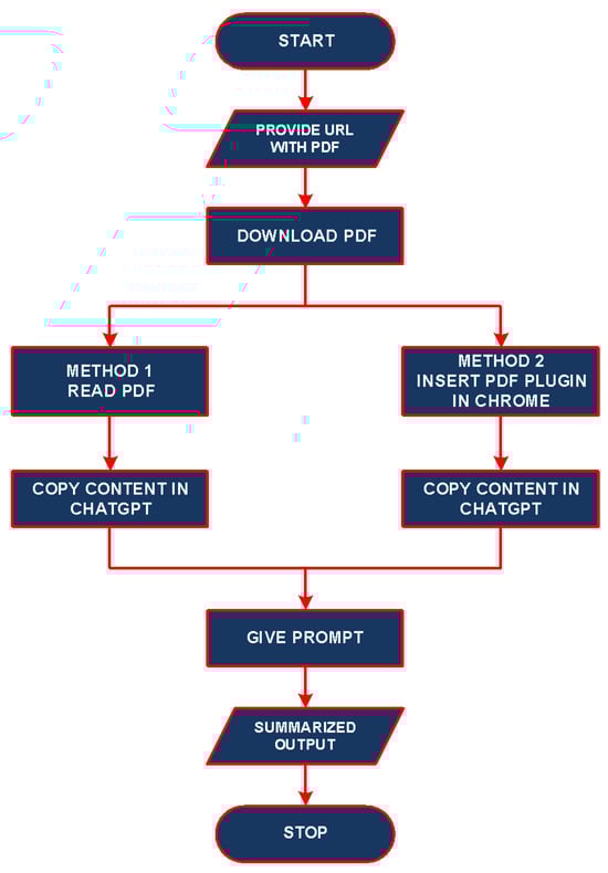 The methodology for text summarization is given as a flowchart in Figure 2. The URL of the pdf is given as input. When the download button is pressed, the paper is downloaded. There are two methods by which text summarization takes place. In method 1, the pdf is read and the contents are copied into ChatGPT. Further, a prompt is given to summarize the text. In method 2, using the chrome browser ASKYOURPDF plug-in is installed. When the pdf is uploaded, a unique id is generated. This id is given to ChatGPT and an appropriate prompt is given as input to get the summarized text.
