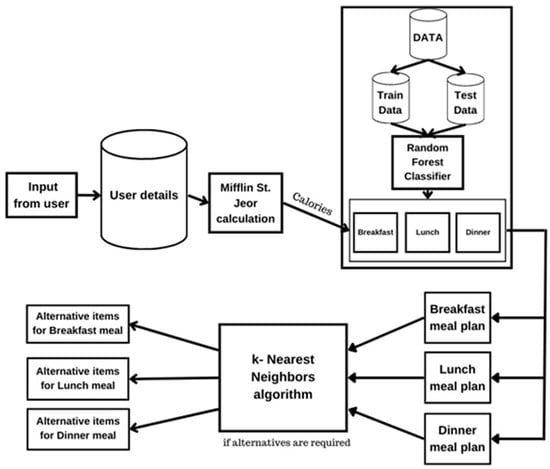Garcia et al. conducted a study on different recommender systems in the healthcare domain []. The paper first started with a study on recommendation systems and their different aspects and techniques. The different techniques studied were collaborative filtering, content-based filtering, knowledge-based recommendation, and hybrid recommendation. Anaka Aiyar et al. designed a diet recommendation framework to overcome PCOS using deep convolutional neural networks []. The framework first uses a CNN algorithm to identify a picture of seven of the user’s meals. To generate a meal plan, it uses the K-Means Algorithm to cluster their dataset. With the help of random forest algorithms, the authors identified the closest cluster according to nutritional requirements. The SVM, NB, and random forest models achieved notable levels of precision and accuracy. In a survey conducted by Absalom E. Ezugwu et al., various clustering algorithms were examined []. The paper covered a wide range of clustering algorithms, including hierarchical clustering methods and partitional clustering methods. Hierarchical clustering algorithms divide the items into classes, whereas partitional methods group items which are similar. Yanli Liu et al. described what random forests are in []. MF Raynor et al. developed a mobile-based personalized diet recommendation system using a random forest classifier model to predict daily calorie intake and macronutrient distribution []. Random forests are a combination of tree classifiers, where each tree casts a unit vote for the most popular class and combining the results provides the final sort result. Mifflin MD et al. provided an alternative and more valid estimate of BMR (Basal Metabolic Rate) [,]. The Harris–Benedict Equations, developed in 1919, were found to overestimate the measured Resting Energy Expenditure (REE) by 5%. This conclusion was drawn after a study involving individuals, during which REE was measured using indirect calorimetry. The system allows users to set dietary goals, track food intake, and receive personalized recommendations based on preferences and nutritional needs. Testing with 30 users showed the system effectively improved dietary habits and achieved weight loss goals, highlighting the potential of using machine learning for personalized dietary interventions through mobile applications. Nguyen PH et al. carried out collaborative filtering using the k-nearest-neighbor method []. The concept was to locate k neighbors in reverse. As fewer rating forecasts were made, discovering the nearby neighbors takes less time. Osisanwo F.Y et al. performed a comparison between the different classification algorithms []. The paper studied a total of nine algorithms, including Naive Bayesian (NB) Networks, Support Vector Machines, and Decision Trees to name a few. It was inferred that different algorithms are better for different datasets and it was difficult to find a single classifier that performed as well as an ensemble model.