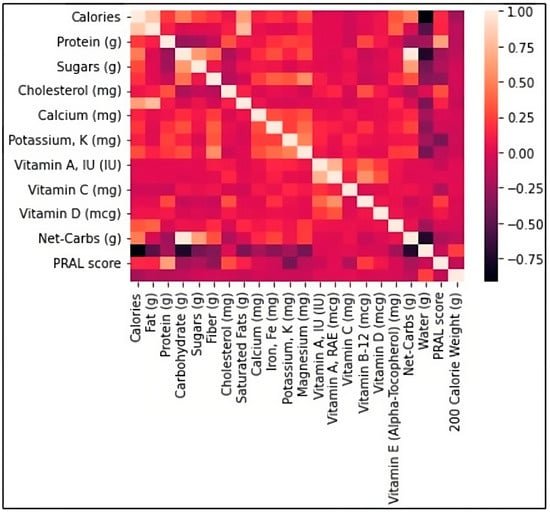 The database used in this research was ‘MyFoodData’. It provides nutrition data which are sourced from the USDA Food Central created based on guidelines from []. The dataset contains 13,628 records with 118 features. All 118 features were not used for the classification model that was to be trained. To understand how closely the features were correlated to each other, a heatmap was generated using the seaborn library as shown in Figure 2.
