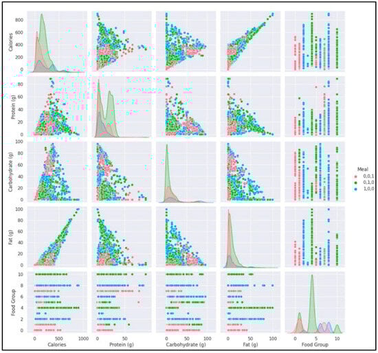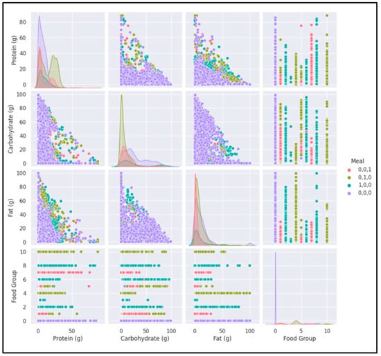 The pair plots against the features ‘Protein (g)’, ‘Fat (g)’, ‘Carbohydrate (g)’, and ‘Food Group’ grouped by ‘Meal’ are given below in Figure 3 and Figure 4.