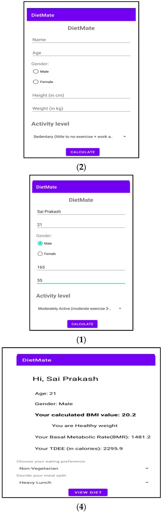 The application was developed using Android Studio, an integrated development environment (IDE) for Android app development. Java programming language was used to code the activity pages while the layout of the pages was designed using XML. The pages included user input fields, drop-down menus, and buttons. The user inputs details such as their name, age, gender, height, weight, and activity level. Based on these details, the application calculates the user’s BMI using the standard formula. The user is then classified as underweight, normal weight, overweight, or obese. The application then calculates the Basal Metabolic Rate (BMR) value of the user using the Mifflin–St Jeor equation. The TDEE value is obtained by multiplying the BMR value with the activity level factor. If the user is underweight, the TDEE value is increased by 20%. If the user is of normal weight, the TDEE value remains unmodified. If the user is overweight, the TDEE value is decreased by 20%. Finally, if the user is obese, the TDEE value is decreased by 30%. The resulting TDEE value is displayed to the user. The user can select their preferences such as non-vegetarian or vegetarian diet, and if they would like to have a heavy breakfast, lunch, or a balanced meal. Based on these preferences, the respective calorie value is passed on to the Python function for diet generation.