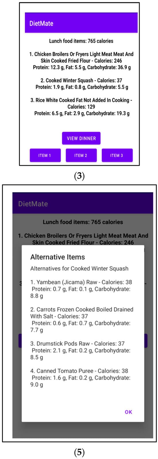 The user inputs their necessary details such as calorie goal, non-vegetarian or vegetarian preference, and meal type. The calorie goal is calculated using the Mifflin St–Jeor equation, and the generated value is passed to the function created for the project. The function uses a pre-defined list of food items for each meal type, namely breakfast, lunch, and dinner. Based on the user’s calorie goal and macronutrient goal, the function selects three to four food items that best match the input and returns them as a response. If the user wants to view alternatives for the suggested food items, the K-nearest neighbors algorithm is used to create a similarity matrix. The list of alternatives is then generated based on the nearest neighbors found. The generated meal plan, along with alternatives, is displayed to the user through the Android application. The user can also provide feedback on the suggested food items, which is stored in the database and can be used to improve the accuracy of the system in the future. The launch screen and the selections of alternatives are as shown below in Figure 6.