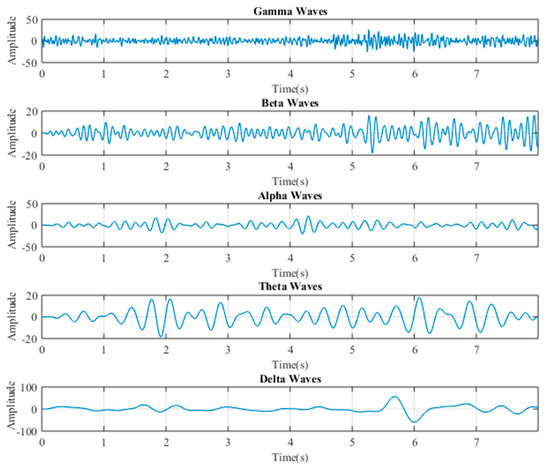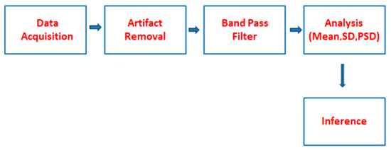 A brain–computer interface (BCI) is a remarkable technology that enables direct communication between the human brain and external devices. As shown in Figure 1, its block diagram consists of several key stages. Firstly, data acquisition is achieved using the Neurosky Mindwave 2 EEG headset, which captures the brain’s electrical signals. Secondly, an artifact removal process helps eliminate unwanted noise and artifacts from the acquired EEG data, ensuring the accuracy of subsequent analysis. Following this, a bandpass filter is applied to isolate specific frequency ranges of interest. The bandpass filter in a brain–computer interface (BCI) system plays a pivotal role in isolating specific frequency ranges within the acquired electroencephalography (EEG) data. Its primary function is to extract brainwave frequencies of interest while attenuating or removing frequencies outside the desired range. This is essential because the brain generates electrical signals at various frequencies, each associated with different cognitive states and functions. By using the bandpass filter, researchers and engineers can focus on specific frequency bands, such as alpha, beta, theta, or gamma waves, depending on the application’s requirements. These filtered EEG data are then more effectively used in subsequent analysis and interpretation stages of the BCI system, enhancing its accuracy and reliability for tasks like thought recognition, control of external devices, or neurofeedback applications. In the analysis block, critical parameters such as mean, standard deviation, and power spectral density are calculated, providing valuable insights into the brain’s electrical activity patterns. Lastly, in the inference block, these processed data are used to make interpretations or drive actions, facilitating real-time communication or control with external devices (Figure 2).