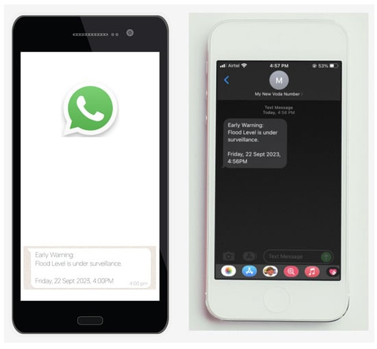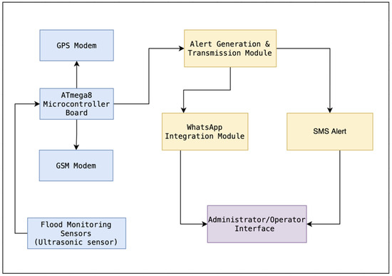 Figure 1). In order to detect flood conditions or inconsistencies and send out notifications, it analyzes information collected by the flood monitoring sensors. With specific communication interfaces built between the mobile network modem for SMS and the integrated WhatsApp module for WhatsApp alerts, alerts are generated for both SMS and WhatsApp. This procedure ensures that information about alerts reaches the appropriate flood management personnel as soon as possible.