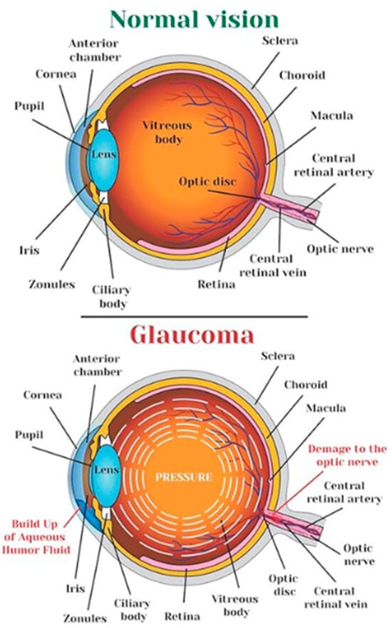 The eye, a sensory organ of the visual system, reacts to light and facilitates the perception of visual stimuli. The optic nerve, a distinct region responsible for visual perception, efficiently transmits visual information from the retina to the visual cortex in the brain. Glaucoma, a prevalent ocular condition, has increased in prevalence due to elevated intraocular pressure. This damage can cause vision impairment and the disruption of blood circulation, leading to ocular conditions like glaucoma. In Figure 1, a schematic diagram of a typical human eye and a diseased eye affected by glaucoma is provided [1].