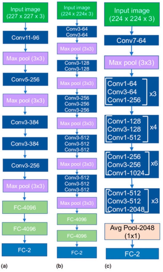 Transfer learning architectures: (a) AlexNet, (b) VGG16 and (c) ResNet50.