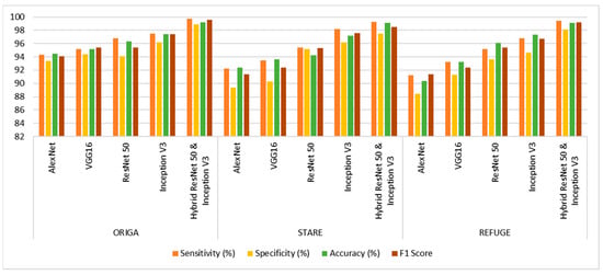 Performance analysis is used to evaluate the structures, resulting in a complete collection of observations that have been rigorously arranged and collated, as shown in Table 1 and Figure 7. Examining the tabular data shows that the ORIGA dataset produced remarkable results. A maximum accuracy of 99.2%, sensitivity of 99.7%, specificity of 98.9%, and F1 Score of 97.4% are achieved. The STARE dataset has a superior classification accuracy of 99.1%. It has excellent sensitivity (99.3%) and specificity (97.5%). An excellent performance was achieved with the REFUGE dataset. The greatest accuracy is 99.1%, while the F1 Score is 98.5%, indicating good classification precision. Additionally, the sensitivity, which assesses positive occurrence identification, is 99.4%. The specificity, which measures the ability to recognize negative occurrences, is 98.1%, with an F1 Score of 99.2%. The REFUGE dataset is handled effectively and reliably using the employed approach.