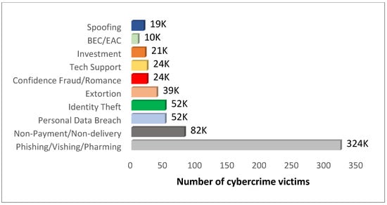 Social engineering uses coercive control to acquire sensitive data. It is common for people to receive messages from friends asking for immediate financial assistance via social networking platforms [21]. Normally, these messages are not sent with any password protection to prevent crime. As it is very easy to assess the information related to bank accounts, cybercriminals use various tricks and tactics to gather information about any individual with the help of social engineering [10]. Phishing emails look very professional, like tax refund scams, false iCloud update notifications, human resource survey scams, and owners asking employees for login credentials or bank details. Cybercriminals try to scare their targets so that they do not inform any organization which deals with cybercrime. Criminals sent millions of emails to gather details. The most common type of phishing is deceptive phishing. Here, fraudsters pretend to be a legitimate body to steal personal details or login credentials. There were 34% more phishing incidents in 2021 than in 2020, and almost 13 times more compared to 2017 [24]. Figure 3 below shows the number of cybercrime victims in 2021 [23].