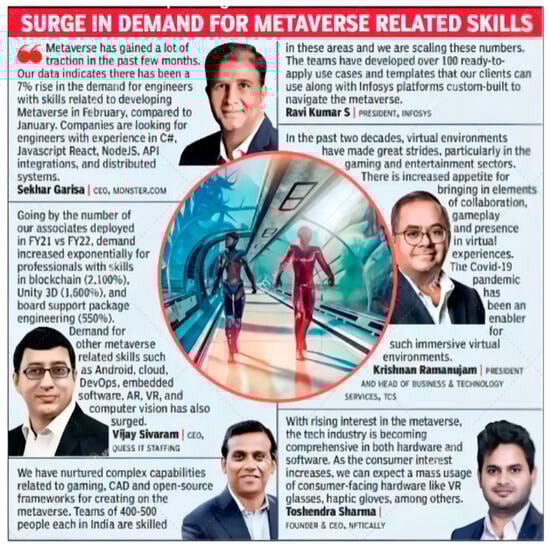 The observed trend has prompted speculation suggesting an imminent development of comparable significance to the advent of the internet []. Presently, this phenomenon has gained widespread global attention, compelling numerous businesses to adopt a novel narrative for the construction of their metaverse, to provide their clientele with an engaging and compelling experience, as shown in Figure 1, where a newspaper article discusses the surge in demand for skills that complement the metaverse.