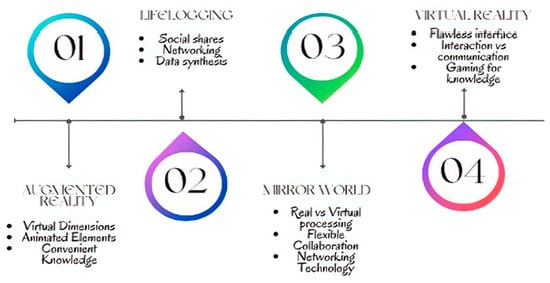 The more one searches for information about the metaverse, the more one encounters enthusiastic descriptions of seamless connectivity and futuristic gadgets [,]. Metaverse can be divided into several categories. The following subsections name and explain these categories in detail. Addictions to online platforms and ideas that will be included into the metaverse in one way or another, such as social media, mobile phones, augmented reality, and virtual reality games [], have been studied by certain writers. Figure 2 shows the different types of metaverses present.